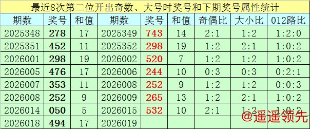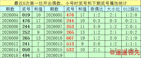 前7次第一位号码开出偶数、小 号时奖号分别为:019、476、244、252、265、241、050,其中奇偶总比例为7:14,有5期奇偶比与上期奇偶比相同;号码大小总比例为7:14,有3期奖号大小比与上期大小比相同;