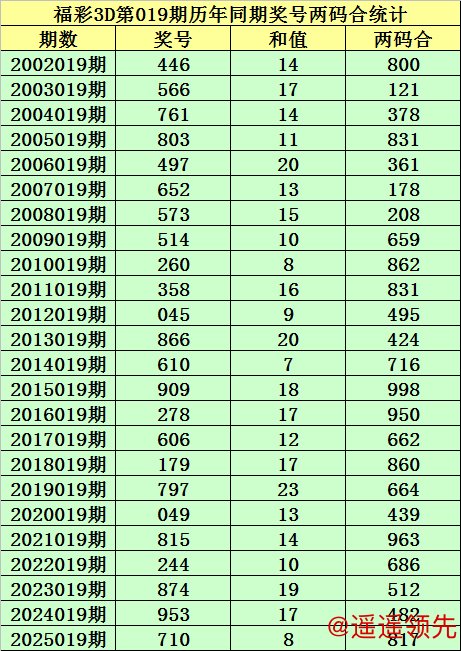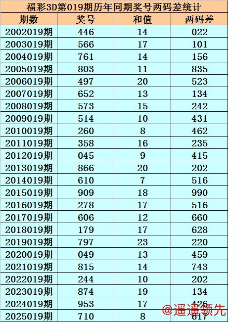 福彩3D第019期,历史上期开出24次奖号,其奖号分别为:446、566、761、803、497、652、573、514、260、358、045、866、610、909、278、606、179、797、049、815、244、874、953、710,奖号两码合差分别开出:
